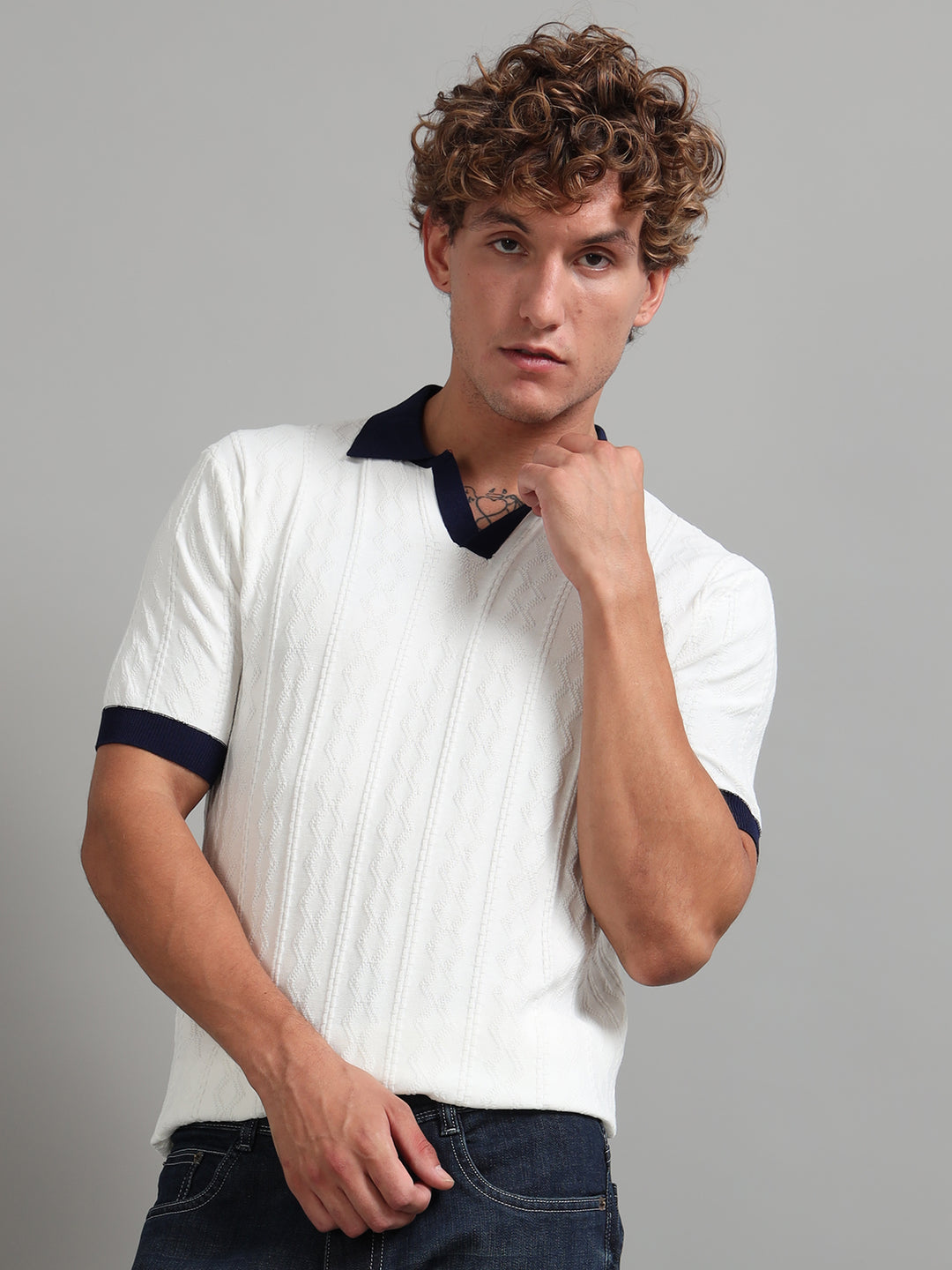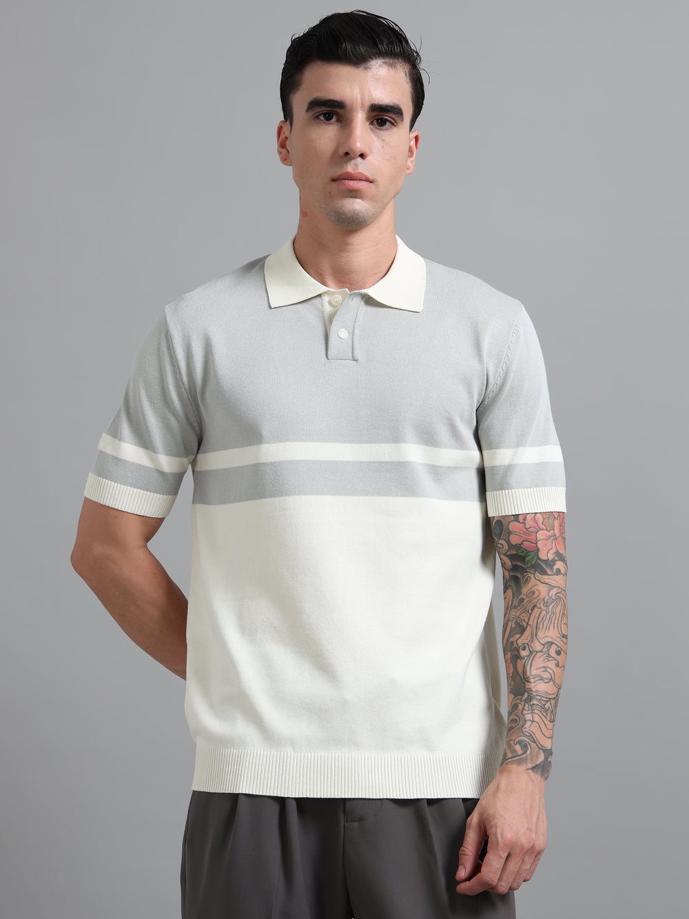 Men’s Knitted Polo T-Shirt with Contrast Vertical Stripes - Beige