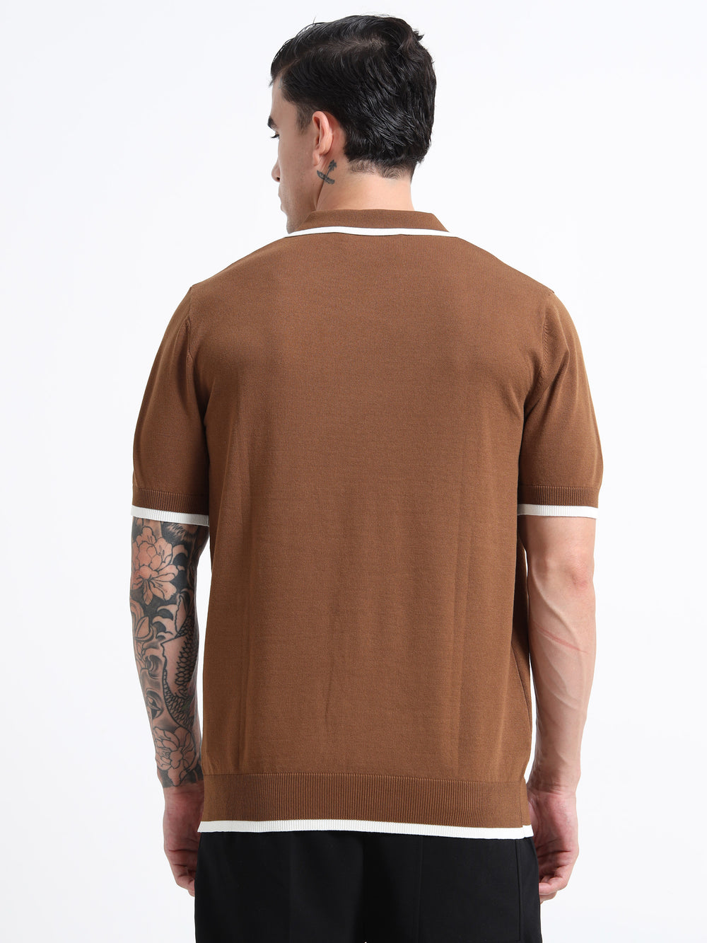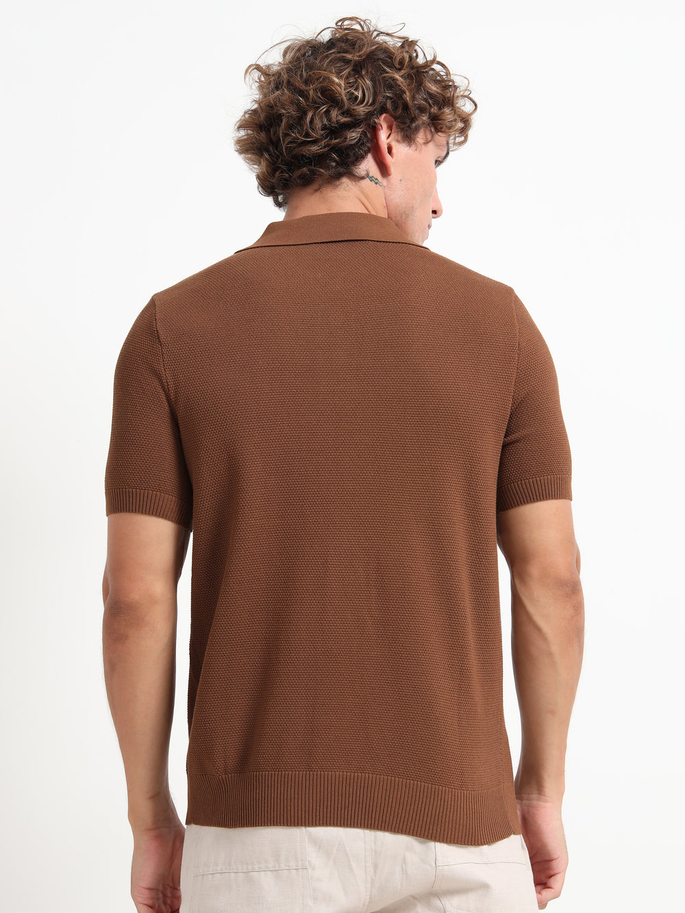 Classic Textured Knitted Polo T-Shirt – Coffee