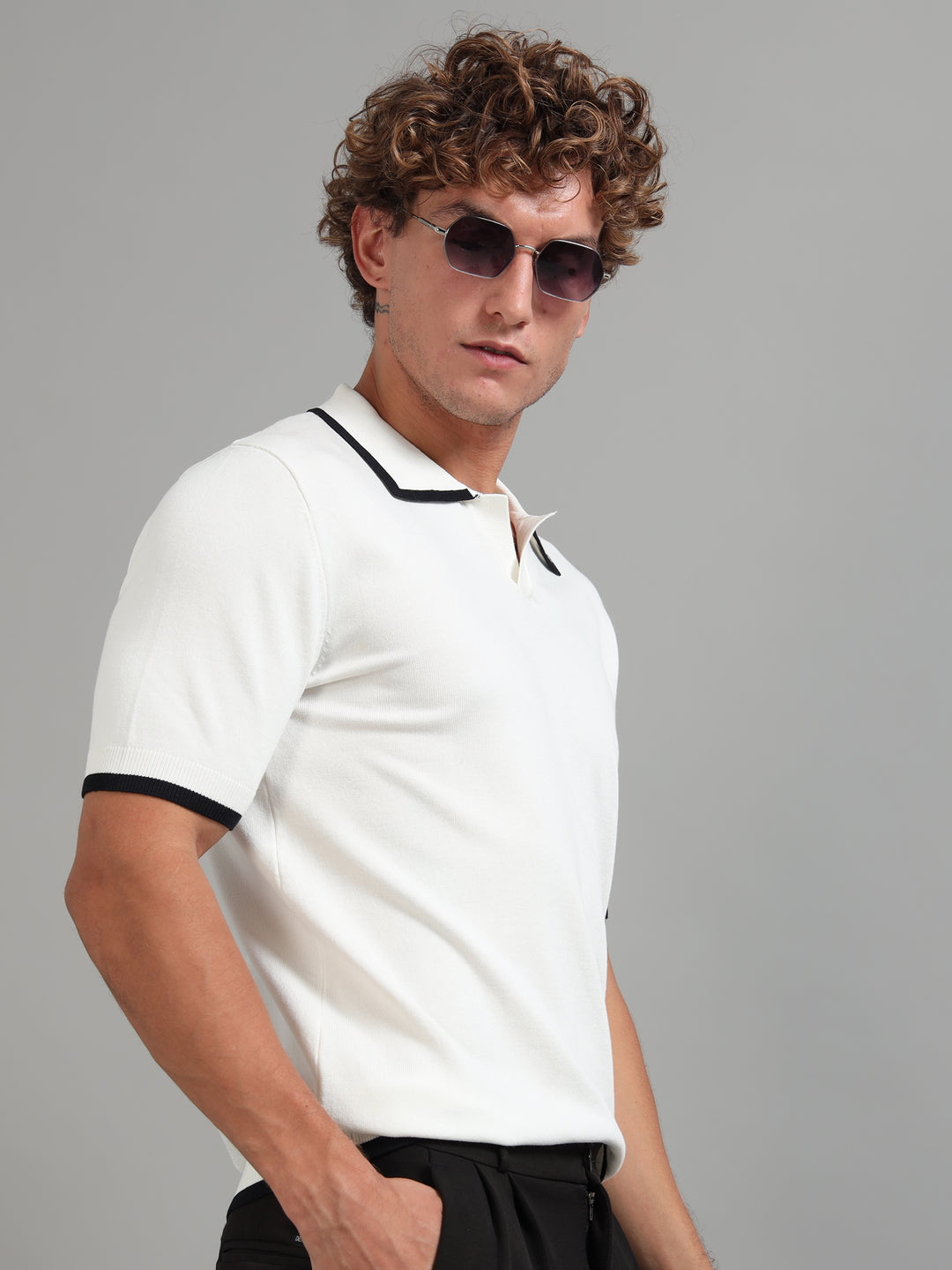 Men’s Knitted Polo T-Shirt with Contrast Vertical Stripes - Black