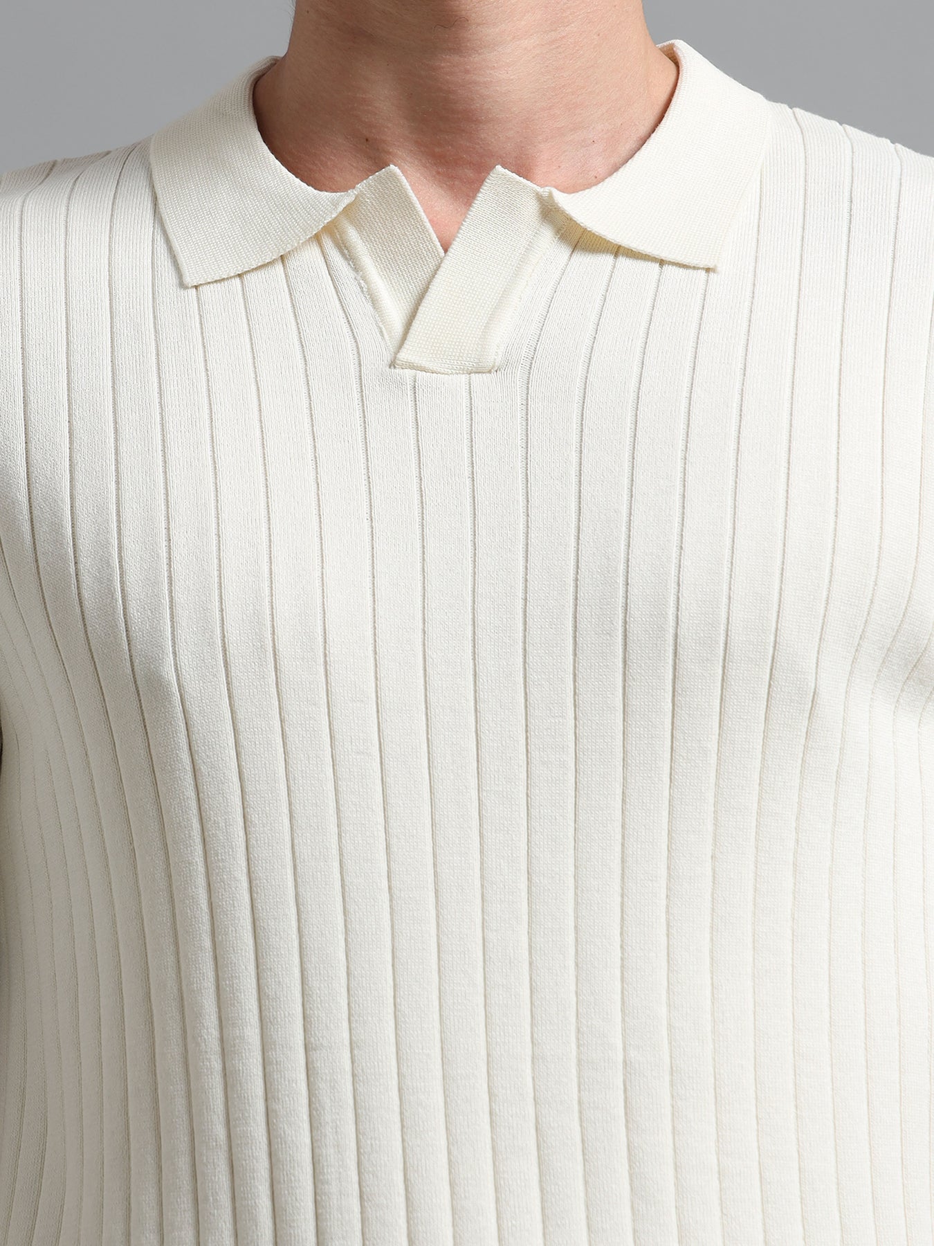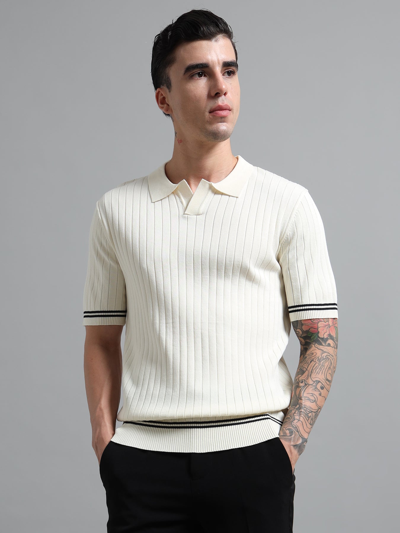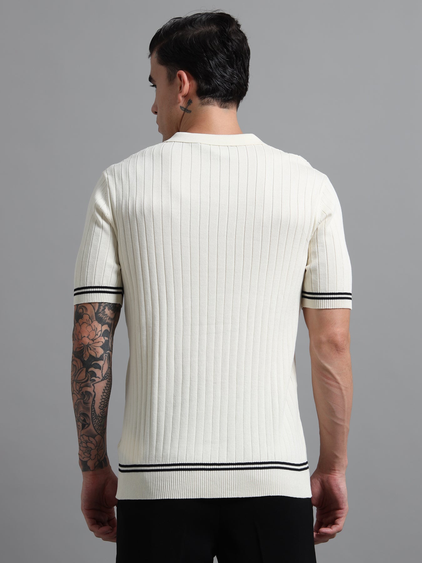 This men's knitted polo T-shirt features a refined "V" collar without buttons, complemented by elegant double black lines along the sleeve borders and bottom edge. Crafted from breathable fabric, it ensures comfort and ventilation for all-day wear, making it a sophisticated yet practical choice for your wardrobe.