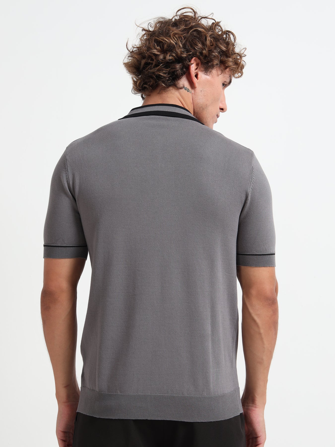 Elevate your smart-casual collection with this premium gray knitted polo shirt, expertly crafted from a breathable cotton-blend knit for lasting comfort. Its quarter-zip front with a contrasting orange zipper and matching trim on the collar and cuffs adds a modern edge to a classic silhouette. The ribbed knit texture enhances durability and visual appeal, while the short sleeves and regular fit ensure a tailored yet relaxed look. Finished with a ribbed hem band, this versatile piece pairs effortlessly with any outfit, making it a refined choice for warm-weather style.