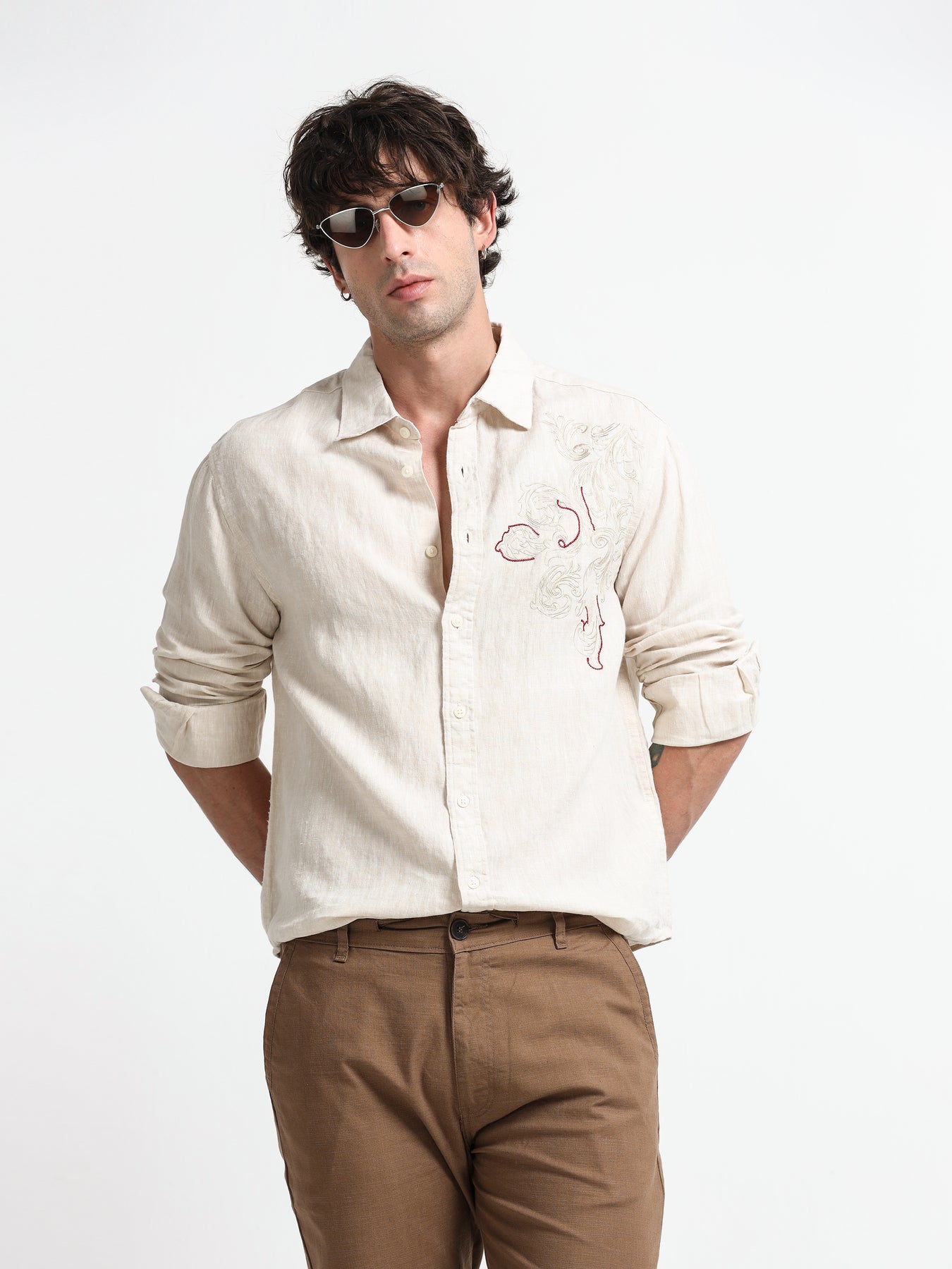 The Verdant Atelier Linen Shirt – Ivory Sand is crafted from a premium linen blend, offering a naturally breathable feel with a refined, soft structure. Designed for warm-weather elegance, the fabric allows air circulation while maintaining a polished silhouette.