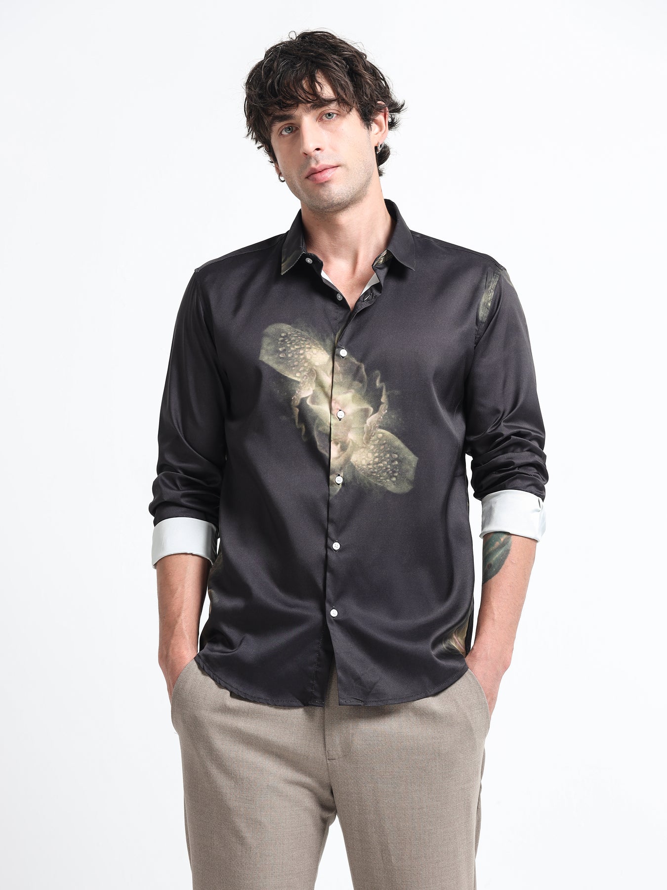 The Midnight Orchid Shirt in Obsidian Ember delivers a dark, commanding presence with subtle botanical detailing that reveals itself under light. Set on a deep charcoal base, the warm floral accents add depth without overpowering the look. Crafted for elevated nights and statement occasions, this piece balances mystery and refinement with effortless ease.