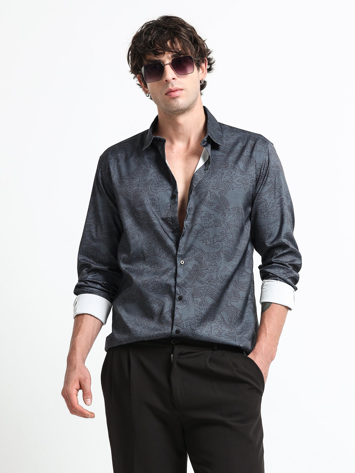 The Midnight Paisley Shirt – Steel Eclipse brings a bold yet controlled statement to evening wear. The intricate paisley pattern layered over a steel-grey base creates dimension and movement, while maintaining a polished, masculine tone.