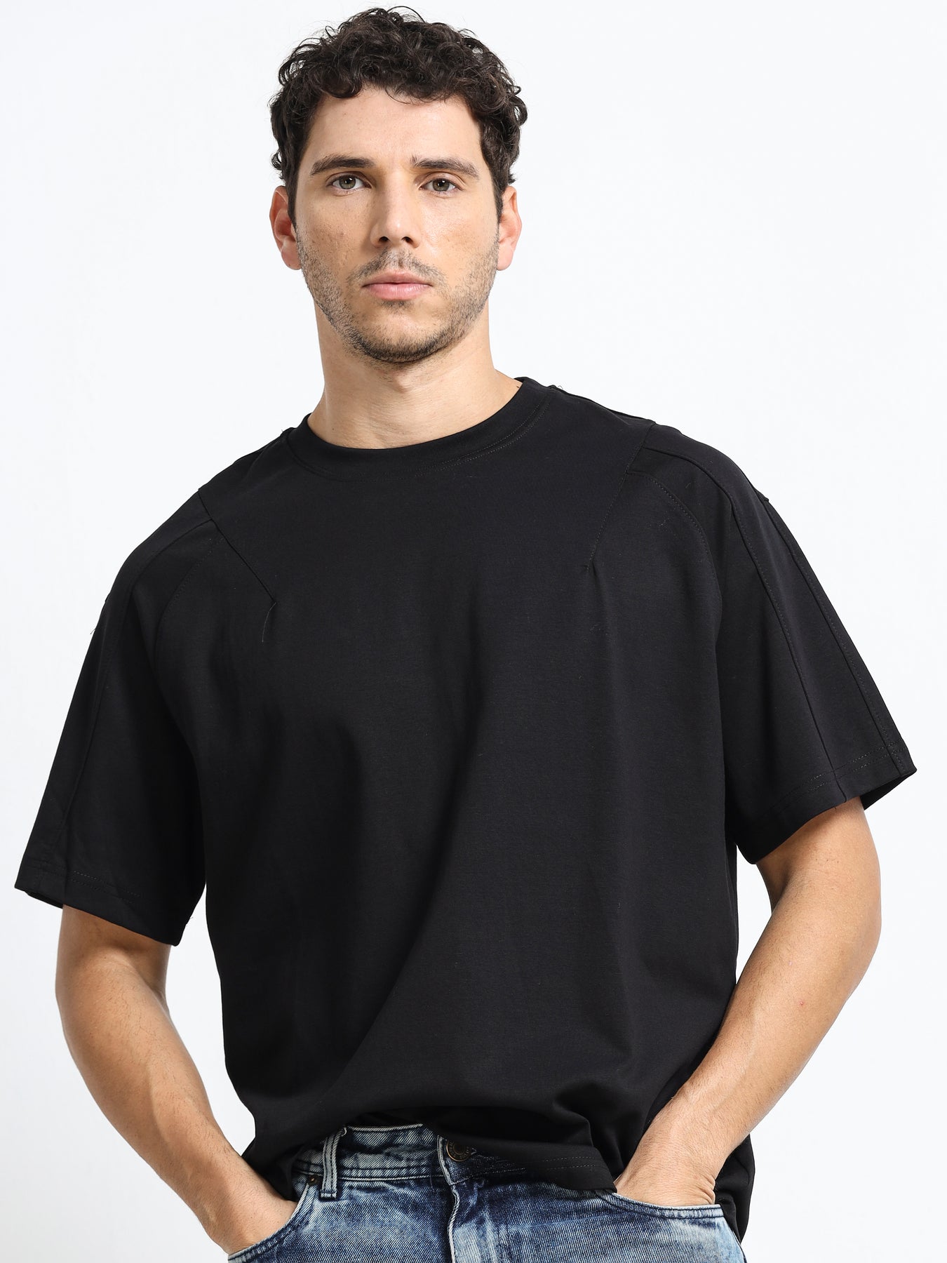 The Classic Contour Black T-Shirt is crafted for effortless everyday style with a refined, modern silhouette. Designed with subtle contour seam detailing along the shoulders, it offers a clean yet structured look that elevates a classic T-shirt profile.