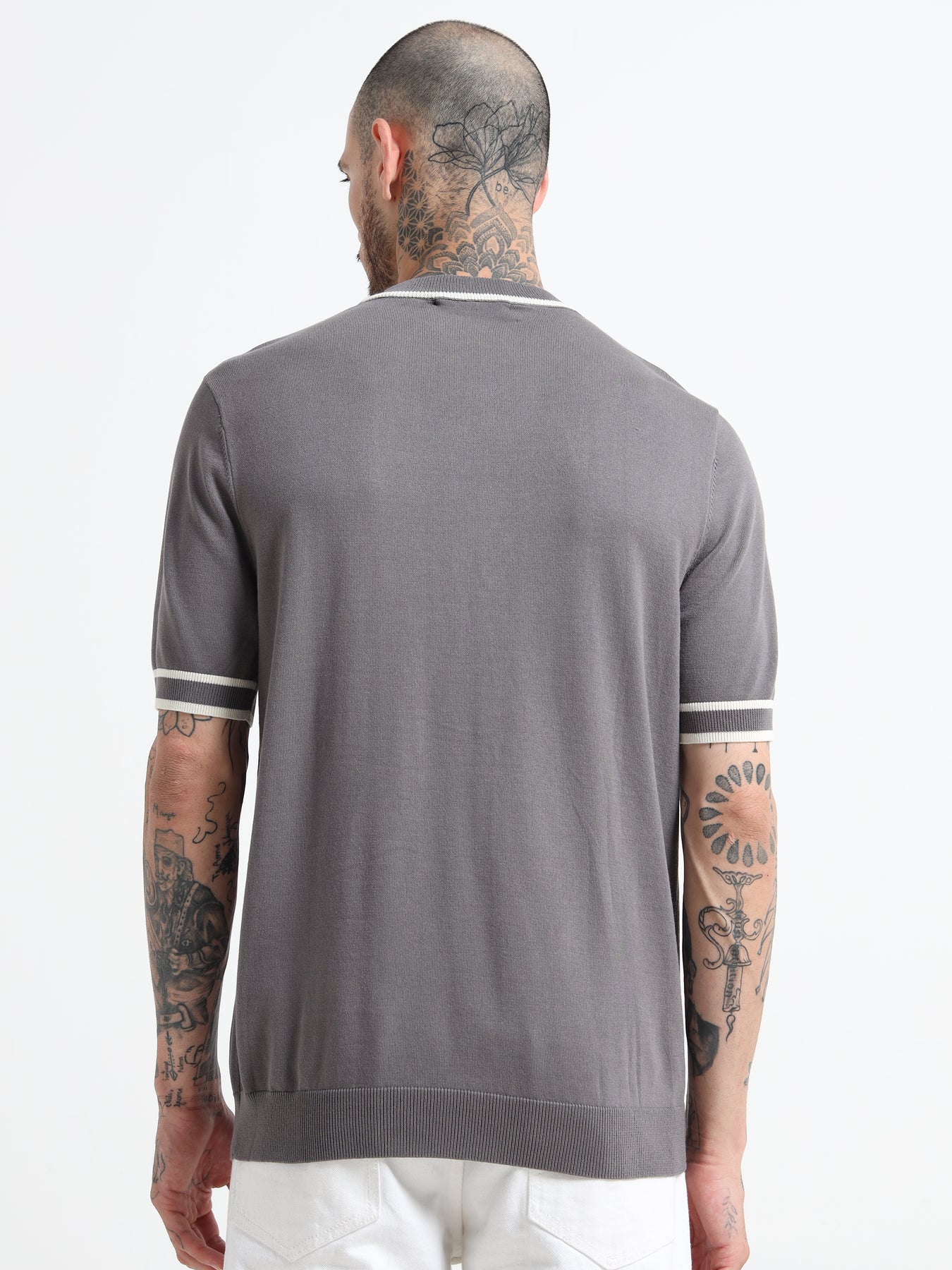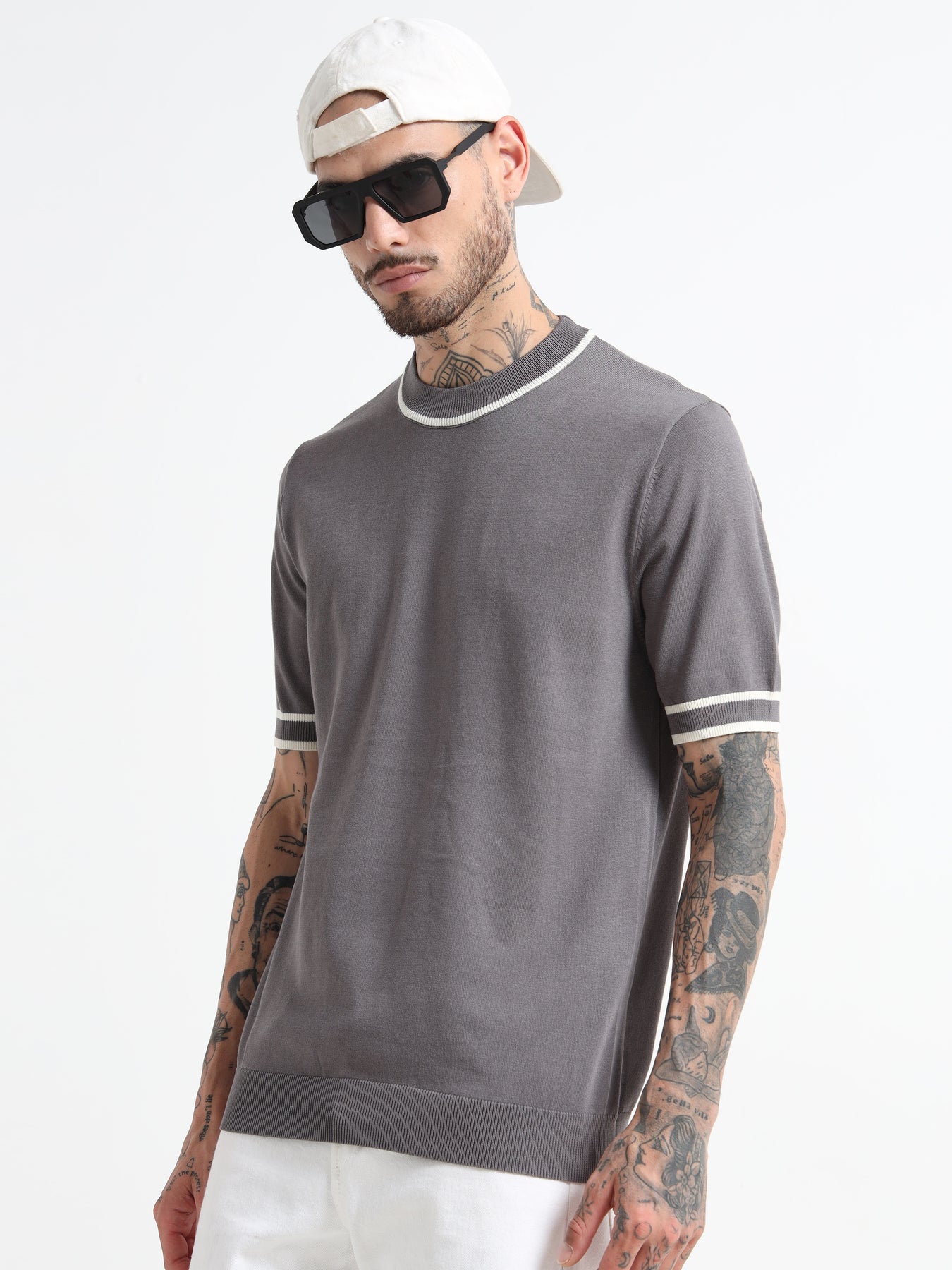 Fine-Knit T-Shirt with Contrast Stripe Trim - Gray