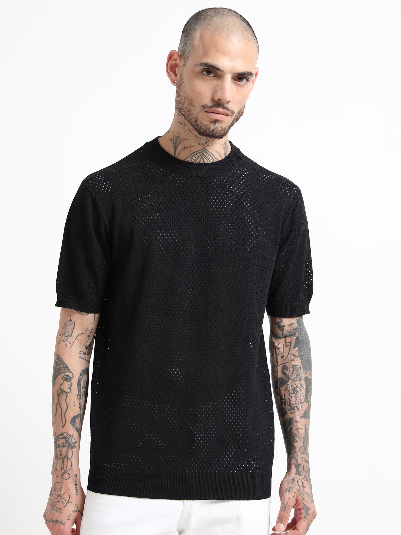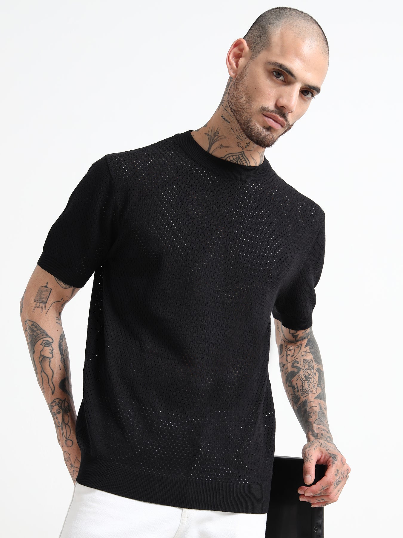 Textured Pointelle Knit T-Shirt - Black