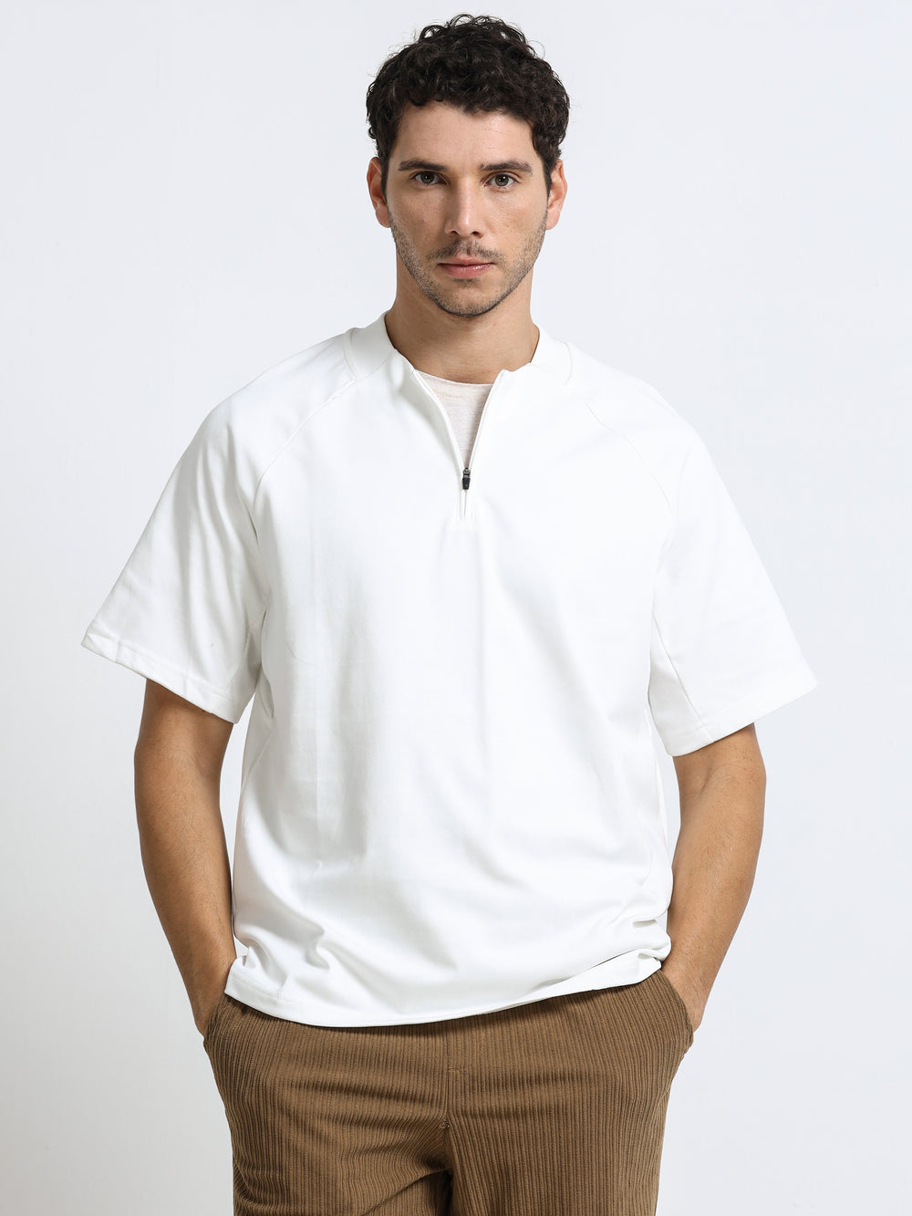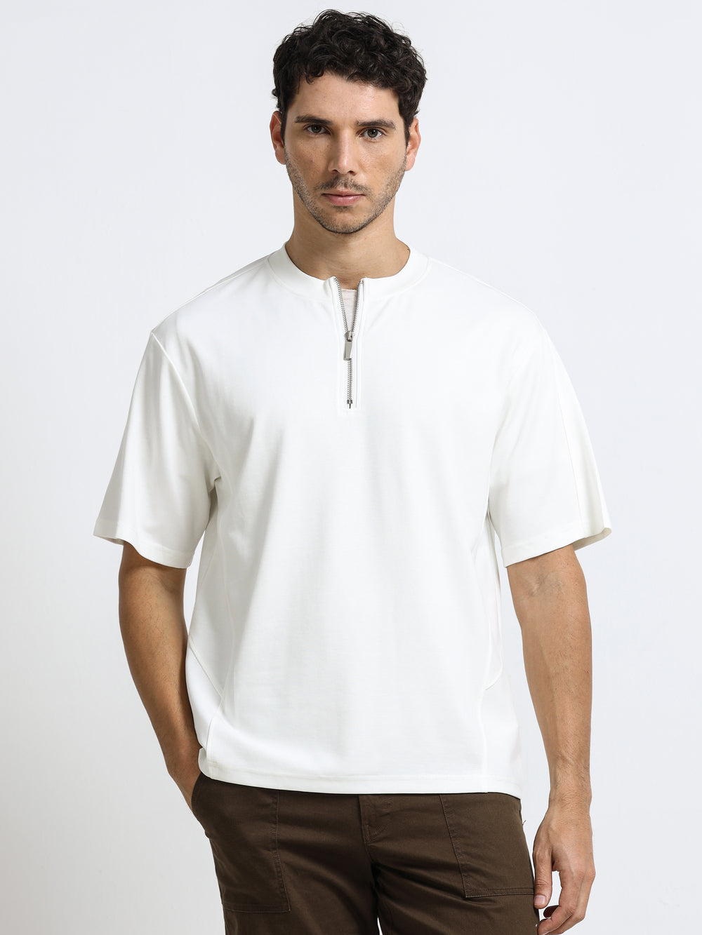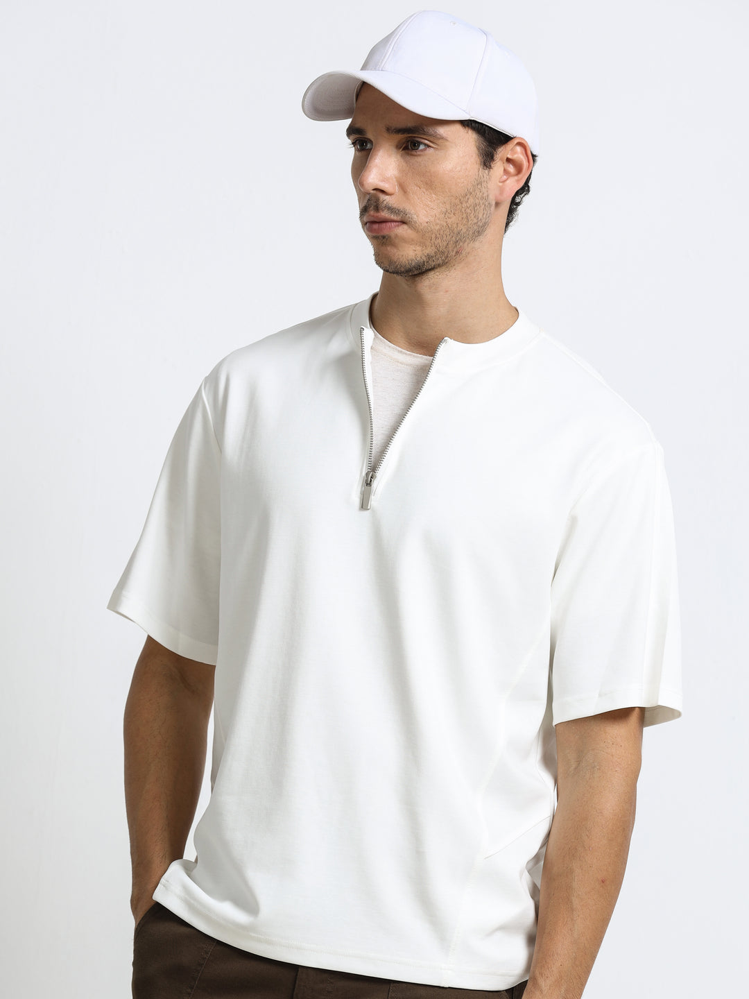 Minimal Zip-Neck White T-Shirt