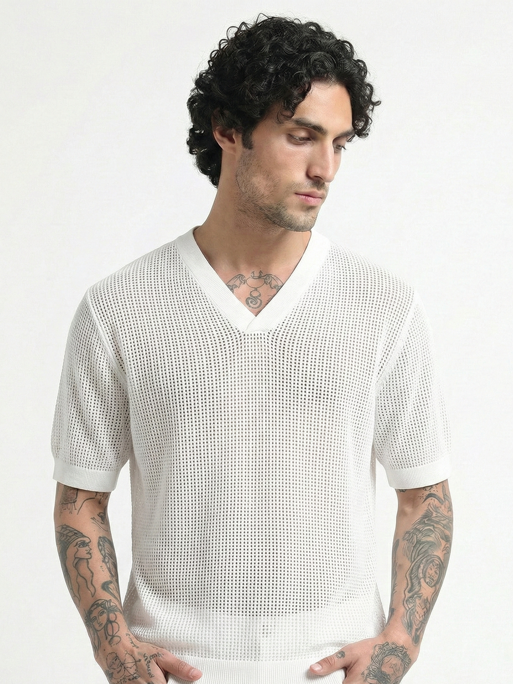 Textured V-Neck Pointelle Knit T-Shirt - White
