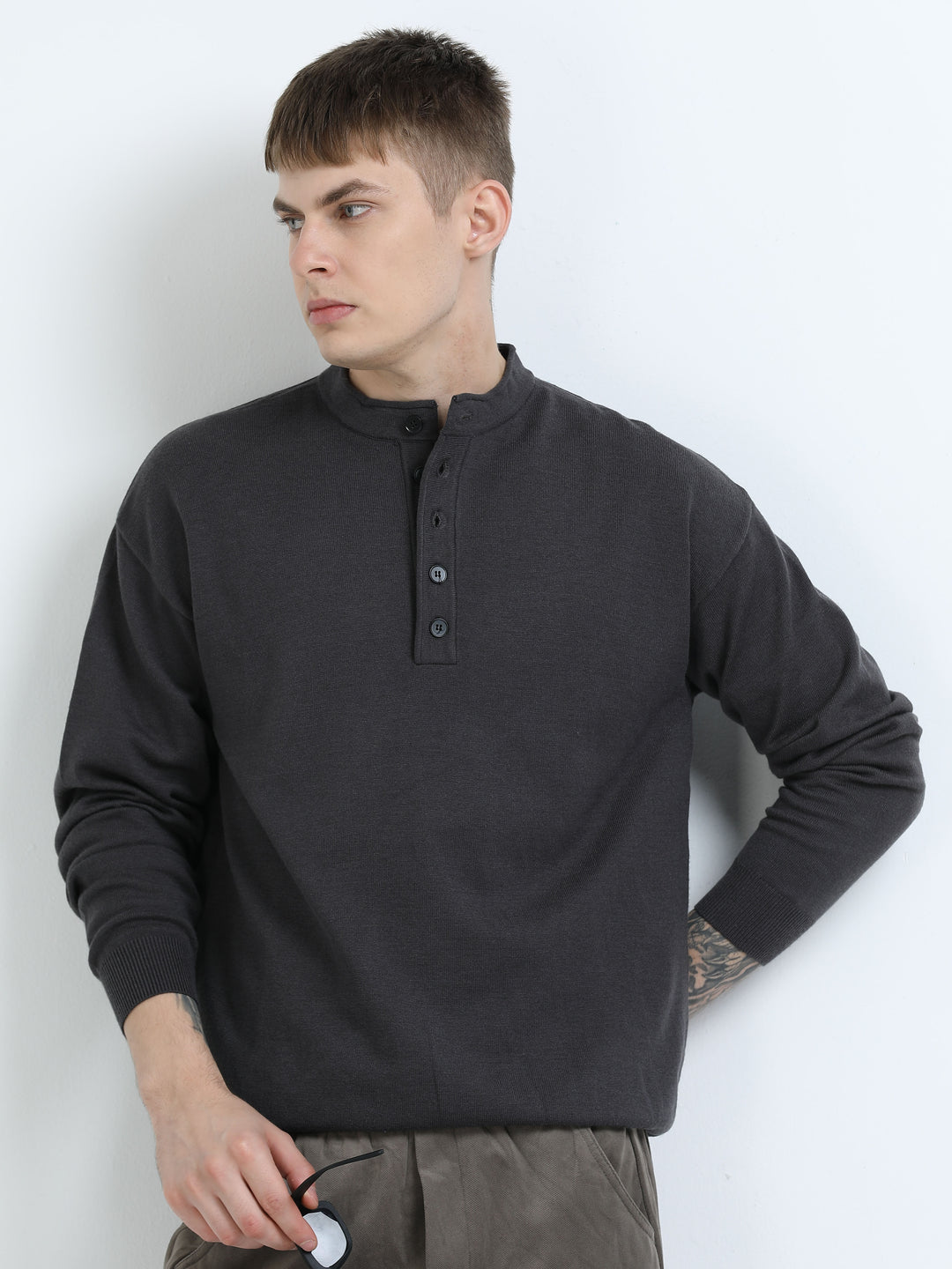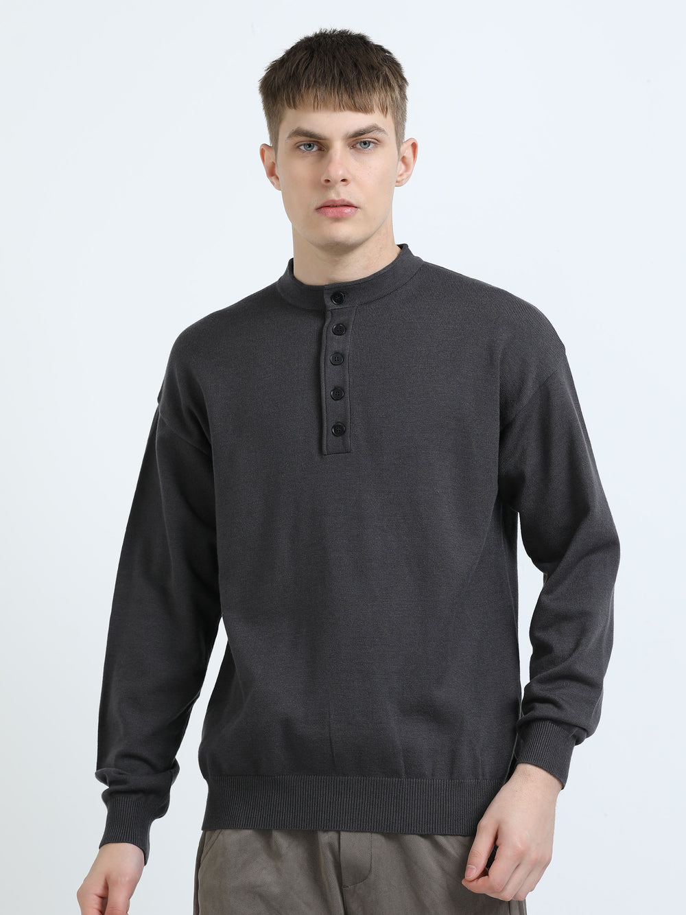 Men's Fine-Knit Henley Sweater T-Shirt - Flower Gray