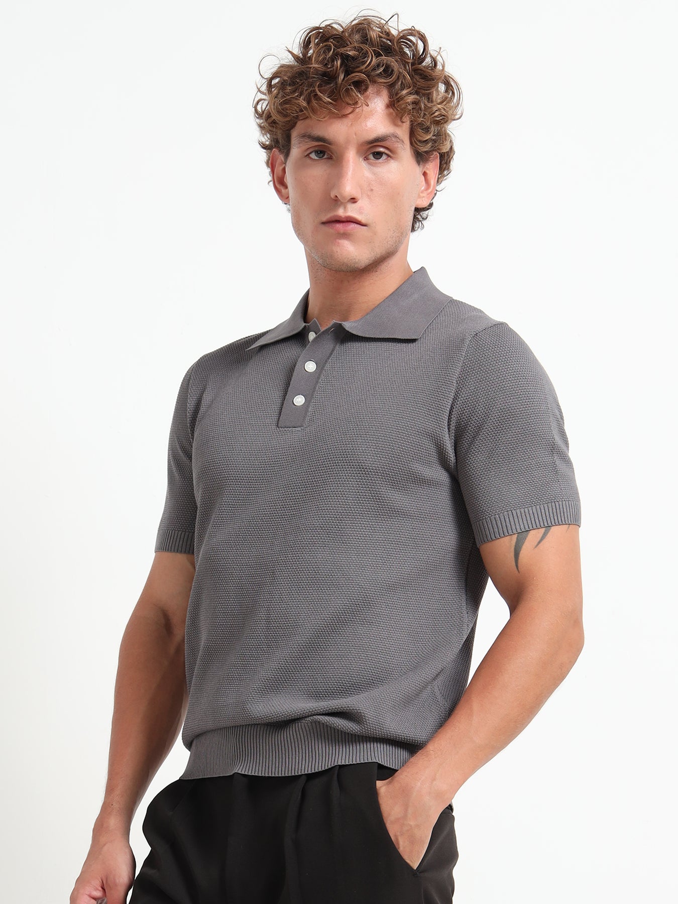 Refined simplicity meets timeless style in this classic gray textured knit polo T-shirt. Crafted from a premium, breathable fabric with a subtle woven texture, this short-sleeve polo delivers both comfort and sophistication. The clean design is elevated by a structured collar, three-button placket, and ribbed trims for a tailored finish. Versatile enough to pair with chinos for a polished look or denim for laid-back charm, this wardrobe essential is perfect for year-round wear and effortless styling.