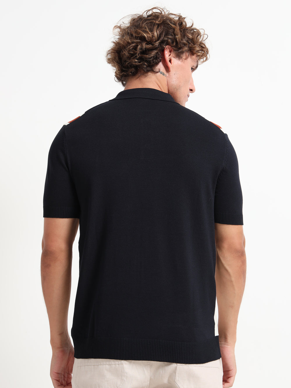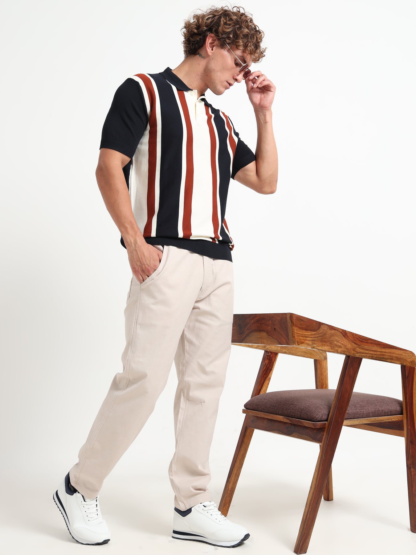 Knitted Polo T-Shirt with Wide Vertical Stripes -Black